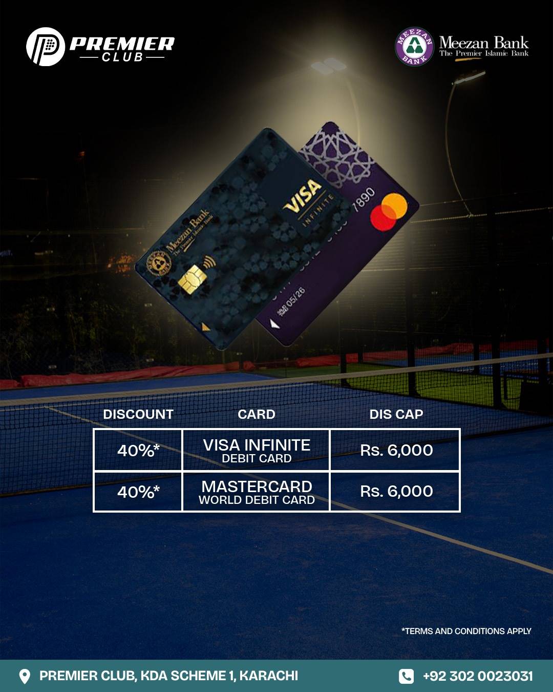 We are delighted to announce that Meezan Bank is now officially active at Premier Club, KDA Scheme 1, Karachi. As part of this exciting new partnership, Meezan Bank customers can now enjoy exclusive discounts on paddle court bookings when paying with eligible Meezan Bank debit cards.